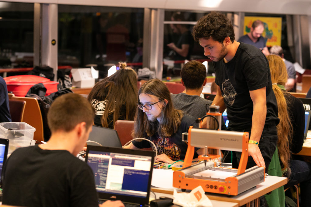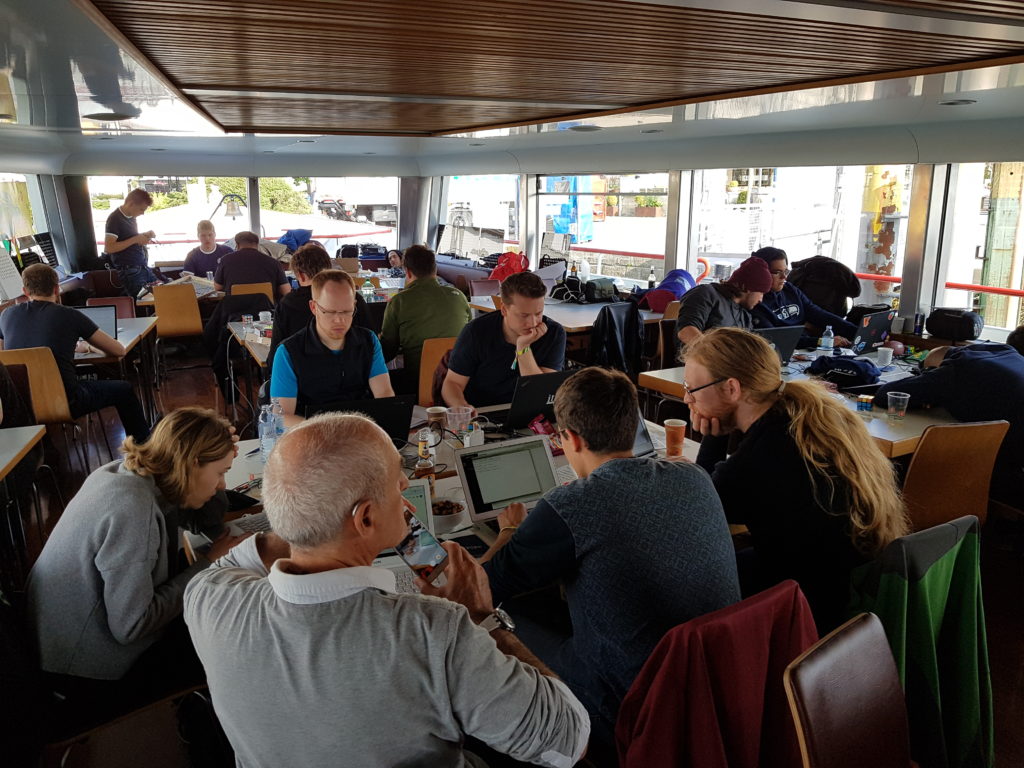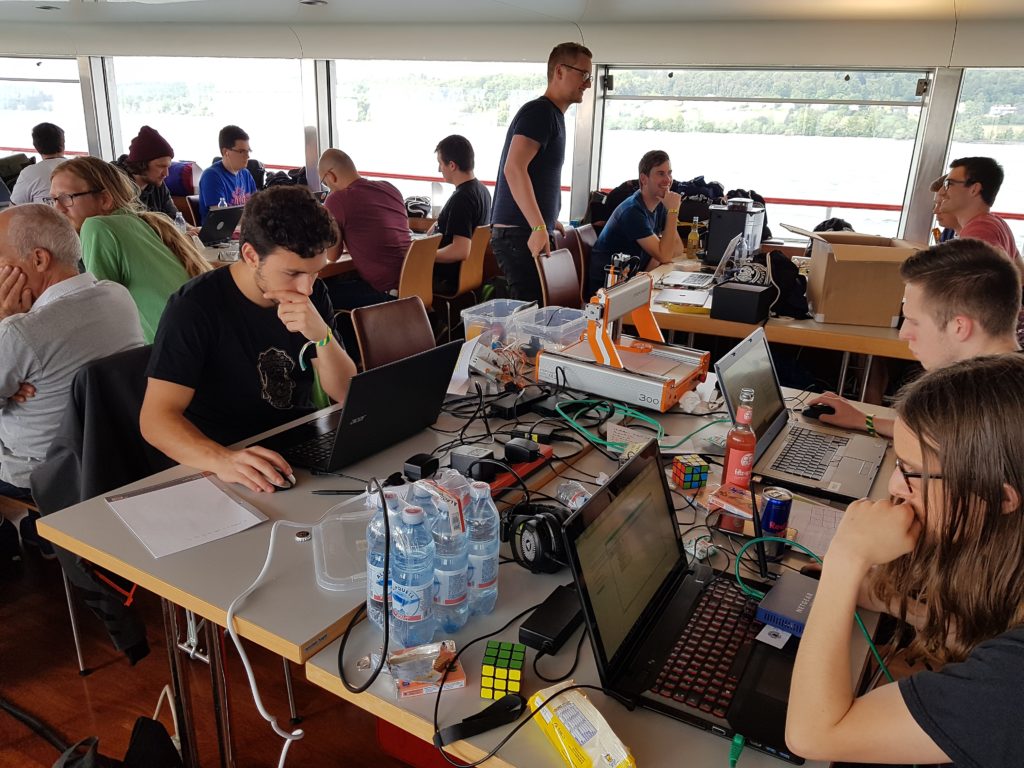Mit Blick auf die vorbeiziehende Landschaft, die kleinen Örtchen und das glitzernde Wasser wird getüftelt und gebrainstormt, Köpfe werden zusammengesteckt, Ideen ausgetauscht. Auf dem Oberdeck beginnt das Tischfußball-Turnier. Eine entspannte Urlaubsatmosphäre legt sich über das Schiff, was dem Arbeitsfleiß der Hacker-Gruppen aber keinen Abbruch tut. Auch ein Blick zum Kinderhackathon zeigt: Hier wird schon fleißig an den ersten Prototypen gebastelt.
