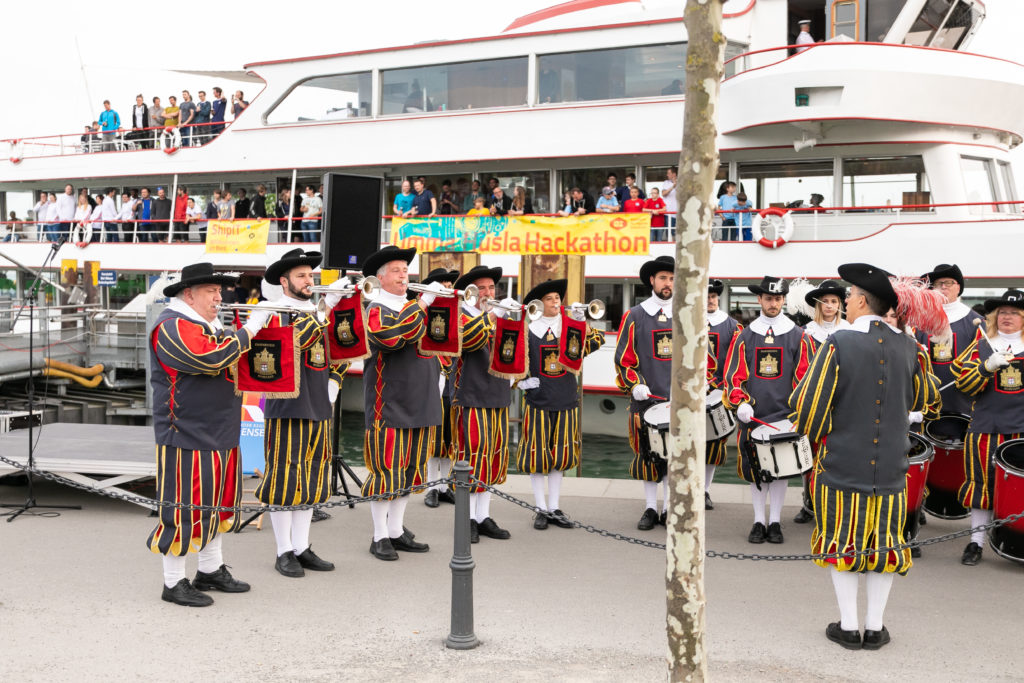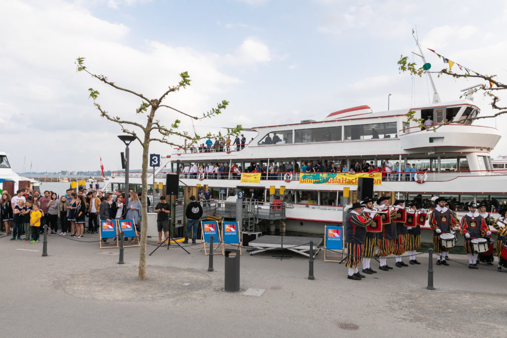 Die Imperia ist in Sicht, das Schiff lichtet den Anker im Konstanzer Hafen. Mit Fahnenschwingern und Fanfarenzug vor dem Konstanzer Konzil wird der Umma Hüsla Hackathon empfangen. Stadtrat Dr. Matthias Schäfer begrüßt die Teilnehmer, Veranstalter und Gäste. Besucher und Presse betreten neugierig das Schiff und lassen sich von den Verantwortlichen Ideen und Projekte erklären. Manche Teilnehmer zieht es in den Baumarkt, um Material für den Bau eines Prototypen zu besorgen.