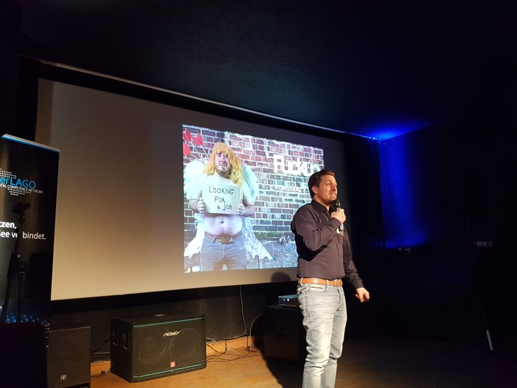 Mit Kunst Geld verdienen, dieses Ziel verfolgte Guido Sondern, als er mit einer Kunstausstellung mit Werken von Friedensreich Hundertwasser die Landesgartenschau in Norderstedt bereichern wollte. Das Konzept schien eigentlich vielversprechend, Besucherzahlen und Eintrittspreise waren kalkuliert, Werke zusammengestellt und der Ausstellungsraum festgelegt. Dann gab es gleich mehrfach ein böses Erwachen. Der Ausstellungsraum etwa, ein Kubus aus Glas, an dem sich Bilder kaum aufhängen ließen, lag fernab von Ein- und Ausgang der Landesgartenschau und lockte kaum Besucher. Viele weitere Probleme reihten sich ein. Anstatt des leicht verdienten Geldes wartete am Ende ein fettes Minus auf dem privaten Konto. Was folgte, waren Schulden, Gläubiger und der Hartz-4-Antrag. „Das ist wirklich kein schönes Gefühl, wenn man mit Mitte 20 einen solchen Antrag ausfüllt. Man fragt sich, was man in den letzten Jahren falsch gemacht hat, dass man trotz unglaublich vieler Arbeit am Ende mit Schulden dasteht.“ Inzwischen ist Guido Sondern privat saniert, hat mehrere Jahre erfolgreich das digitale Kompetenznetzwerk cyberLAGO geführt und ist bei der wirsindhandwerk gmbh als Business Architekt tätig. In Form der Top 8 seiner persönlichen Learnings gab er den Teilnehmern der FuckUp Night einige Ratschläge mit auf den Weg. Und auch er selbst macht nun einiges anders: „Man wird kritischer, hinterfragt mehr und glaubt nicht mehr alles, was einem angepriesen wird.“