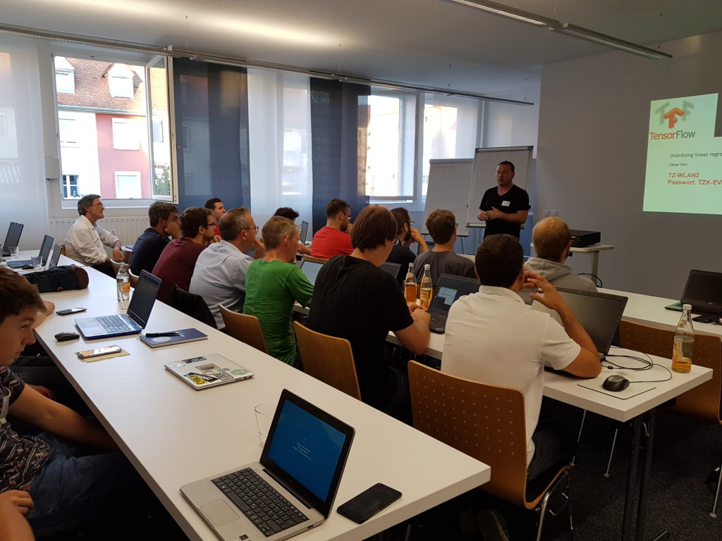 Bei der Auftaktveranstaltung am 20. September gab Prof. Dr. Oliver Dürr, Professor an der HTWG Konstanz mit dem Schwerpunkt Data Science, eine Einführung in Deep Learning. Anhand des Beispiels lineare Regression zeigte er, wie Deep Learning Methoden angewendet und eingesetzt werden können. Als Hands-on Workshop geplant, konnten die Teilnehmer nach einer theoretischen Einführung alle Schritte mit einem Online Notebook live mitprogrammieren. Am Ende der Veranstaltung hatten die Teilnehmer ein ‚Hello World‘ Programm auf einem neuronalen Netzwerk in den Händen, welches für weiteres Experimentieren und Programmieren für zuhause genutzt werden kann.