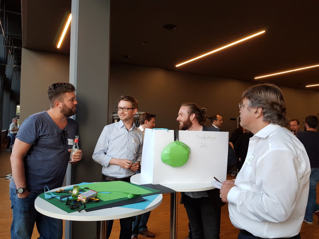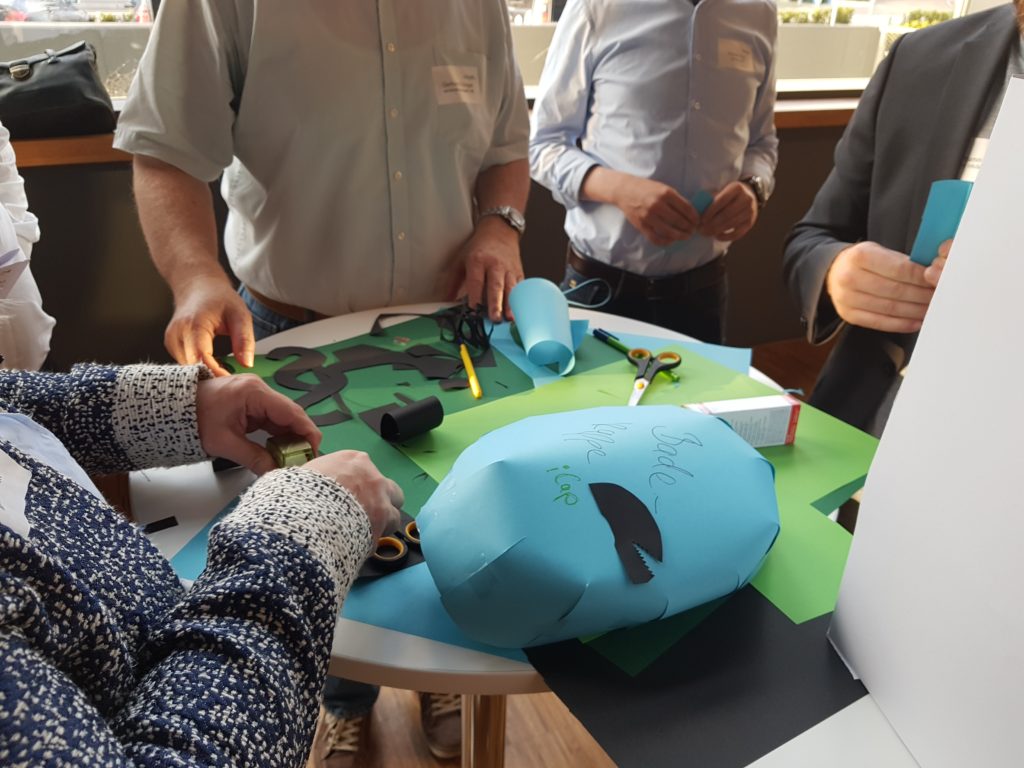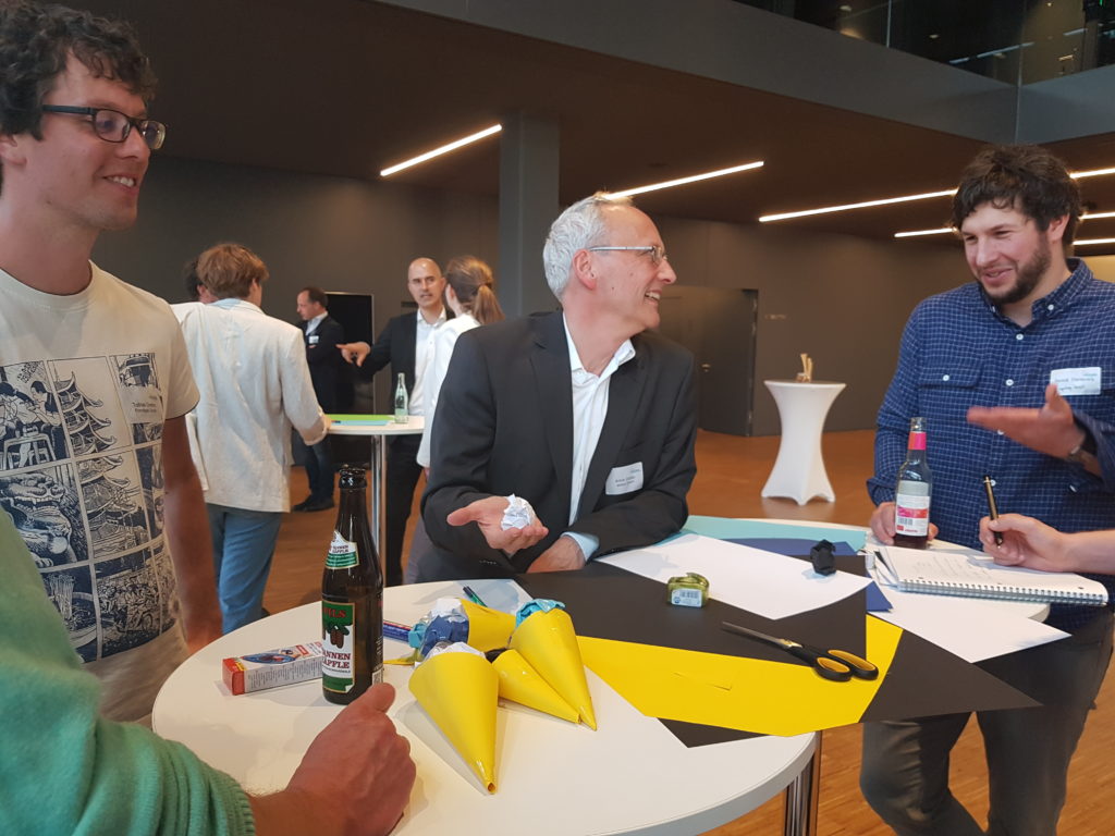 Das sogenannte Prototyping mit Rollenspiel ist eine Methode des Design Thinking. Anschauungsmaterial und Kulissen wurden mit Karton und Papier gebastelt, Abläufe optisch durch Grafiken und Schaubilder dargestellt. Referent Mike Battistella erklärt die Vorteile des Vorgehens: „Rollenspiele fördern das Verständnis, da man selbst etwas macht, anstatt nur zuzuhören. Dadurch bleibt das Erarbeitete präsenter.“ Dabei ist es wichtig, alle Beteiligten eines Teams in den Prozess miteinzubeziehen. Wenn der Chef zum nächsten Team-Meeting also Schere und Papier mitbringt, dann ist wohl Design Thinking angesagt.