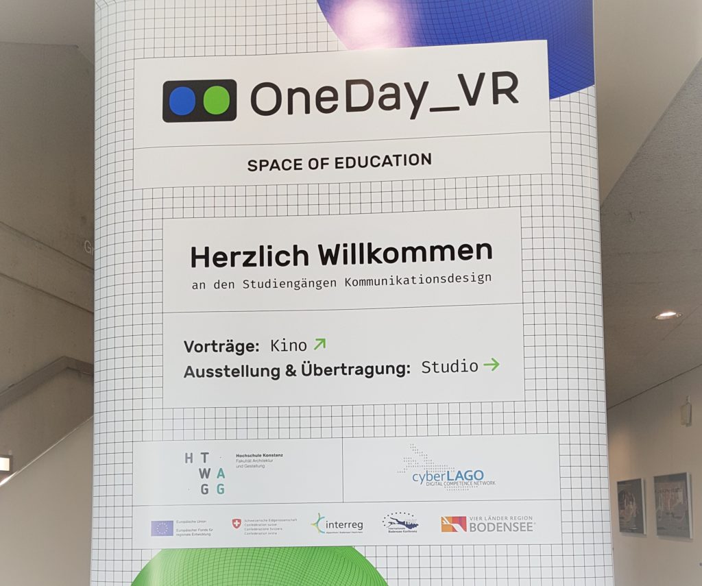 Längst ist die VR-Brille nicht mehr ausschließlich ein Unterhaltungsmittel. Und doch macht es Spaß, in der virtuellen Realität mit 180 Sachen durch die Landschaft zu rasen. Eine Ausstellung mit Möglichkeit zum Selbstversuch war die Pausenattraktion der Tagung »OneDay_VR« im L-Gebäude an der HTWG zu der die Studiengänge Kommunikationsdesign der HTWG Konstanz und das digitale Kompetenznetzwerk cyberLAGO einluden. Unterstützt von den Sponsoren Formigas, SeerheinLab von Seitenbau und Siemens ging es bereits zum vierten Mal darum, neue Trends auszumachen, praktische Anwendungen zu zeigen und über Perspektiven zu diskutieren.