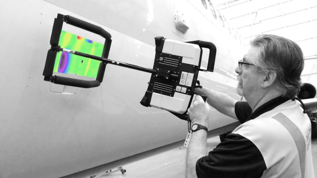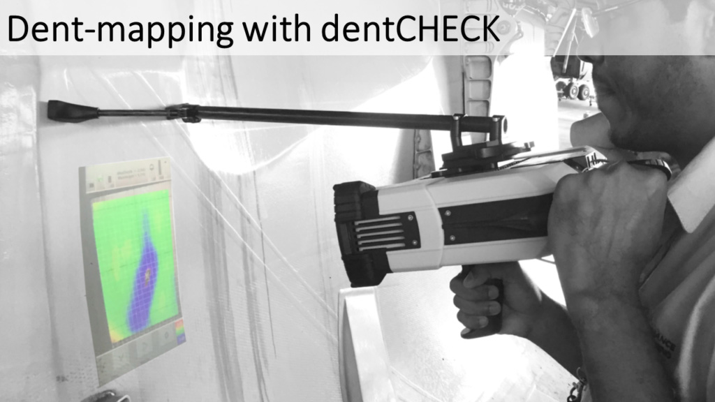 Der Scanner ist batteriebetrieben und allgemein sehr handlich und portabel. Der Anwender scannt die betroffene Oberfläche ab und bekommt die Messwerte mit Hilfe von Augmented Reality (AR) in Echtzeit direkt auf die Oberfläche des Bauteils projiziert. Dieses Verfahren ist von uns patentiert. Anhand der Messwerte werden „Go/No-Go“-Antworten generiert und eingeblendet, die dem Ingenieur zeigen, ob der Schaden die erlaubten Sollwerte überschreitet und eine Reparatur erforderlich ist. Diese schnelle und exakte Analyse ist durch unsere dentCHECK-Plattform möglich. Diese analysiert Oberflächenverformungsprobleme und liefert eine klare, genaue und sofort umsetzbare Analyse. Der Bediener kann also umgehend die weiteren Schritte einleiten und muss sich nicht erst mit der Auswertung von 3D-Daten beschäftigen.